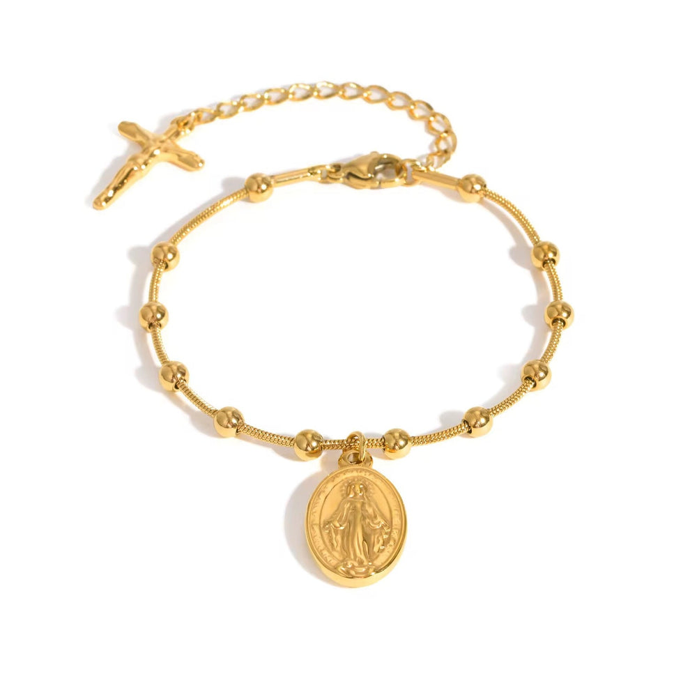 Featuring a delicate cross and Virgin Mary charm, this rosary bracelet represents faith, devotion, and grace — designed to be worn close every day.
